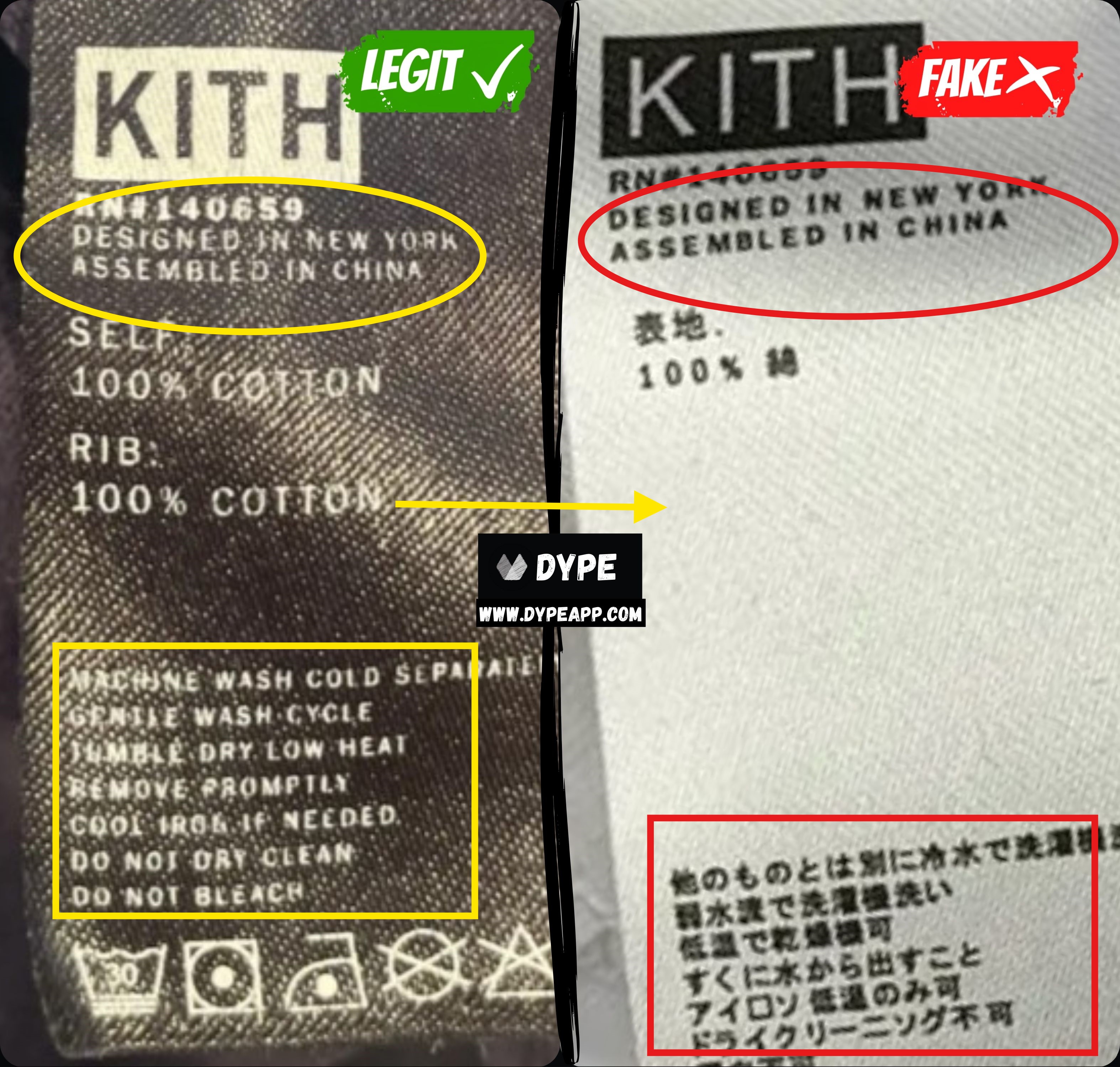 Every Kith box logo tee features wash tags stitched on the side section. Upon close inspection, you'll notice that the font on a fake wash tag is bolder and lacks the finer details found on an authentic tag. Additionally, the authentic wash tags include intricate details like ribs and proper characters, which should never be in Chinese. These subtleties are crucial for accurately identifying genuine Kith box logo tees.