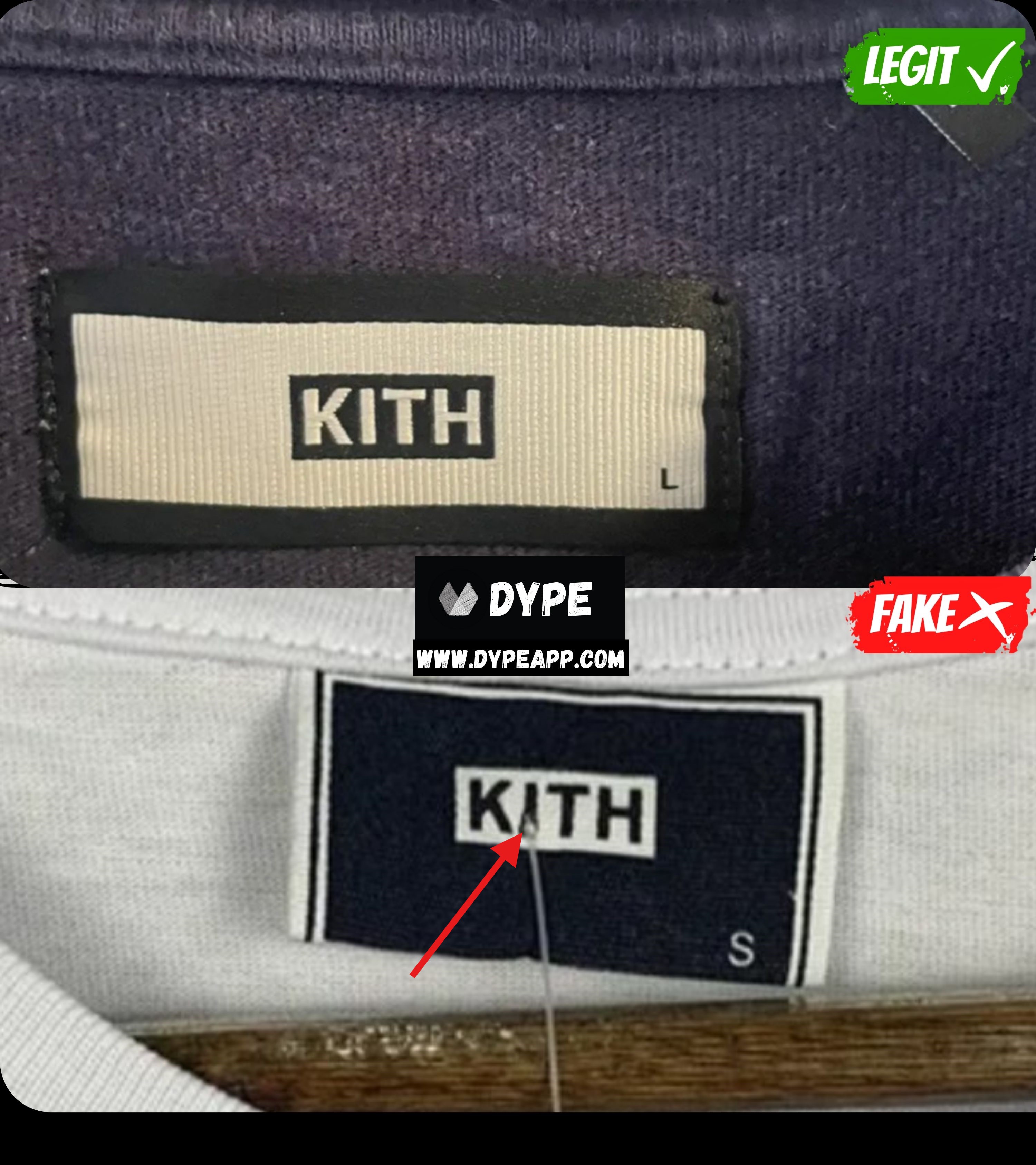 When you flip the authentic label, you'll notice the embroidery is both readable and meticulously executed, reflecting the high standards of craftsmanship. In stark contrast, the embroidery on a fake Kith Box tee appears sloppy and poorly done, unmistakably indicating inferior quality.